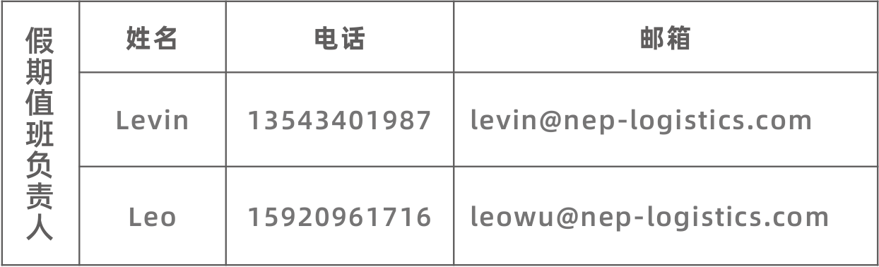 大洋物流集团国内各分子公司特别成立值班小组,春节值班小组人员及联系方式公布如下,您有任何需求,可根据地区联系相关人员。